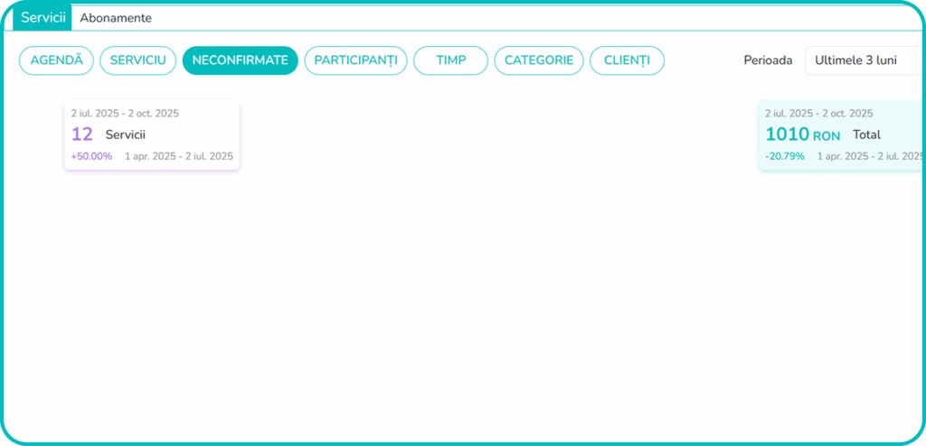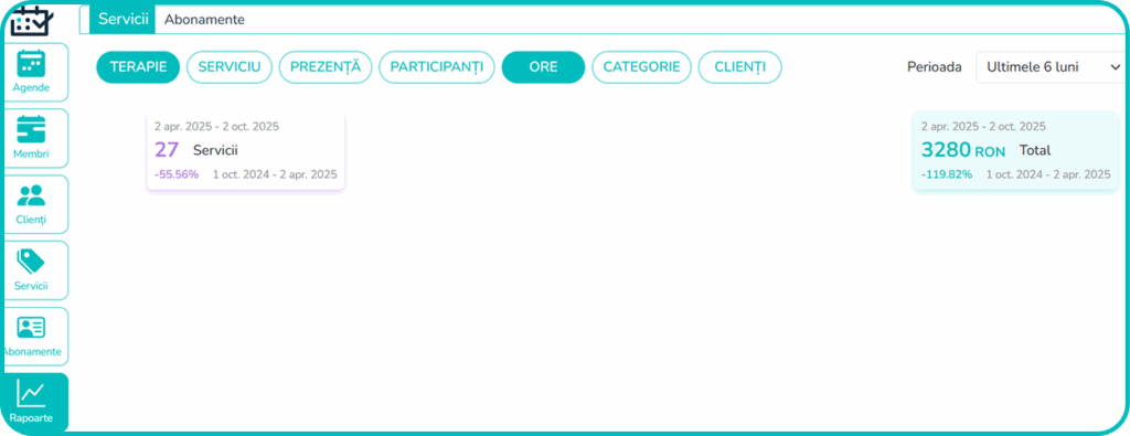 Cu Planific.ro poți analiza activitatea pentru fiecare serviciu oferit. Rapoartele se pot filtra după: